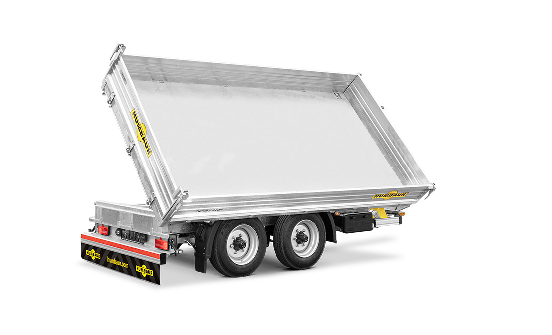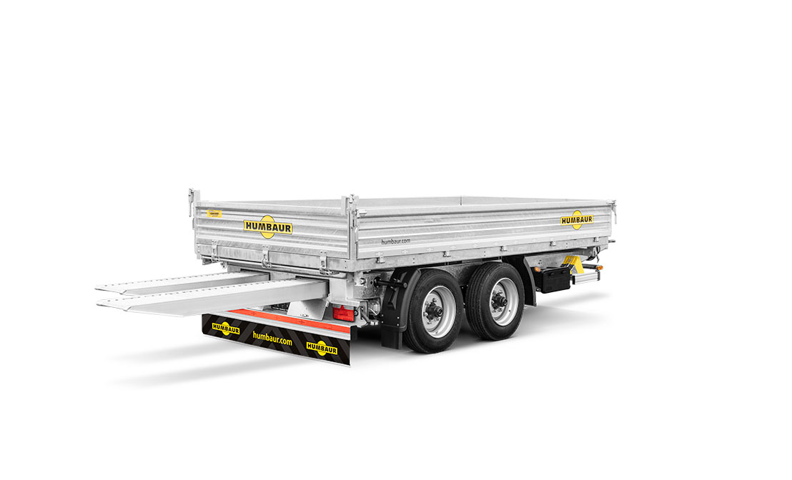 The HTK with a gross weight of 7.5 t is a variable all-rounder. It is particularly impressive with its five-stage hard-chromed cylinder and hydraulic motorised threeway tipper. It has a sturdy, welded, hot-dip galvanised frame for optimum stability and safety. The platform floor is made from 4 mm fine-grained steel. The 500 mm high hinged drop sides with central lock can be folded down at the sides and rear and removed.